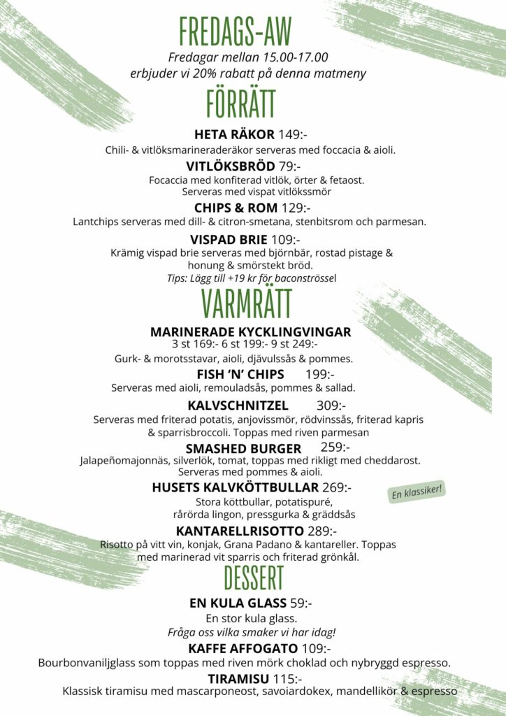 - 20 % rabatt på mat- & alkoholfritt. Full meny från klockan 17.00.