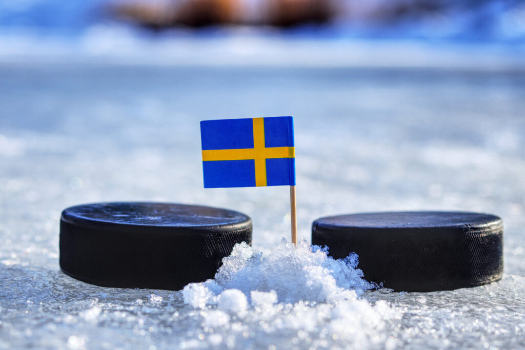 A Sweden flag on toothpick between two hockey pucks